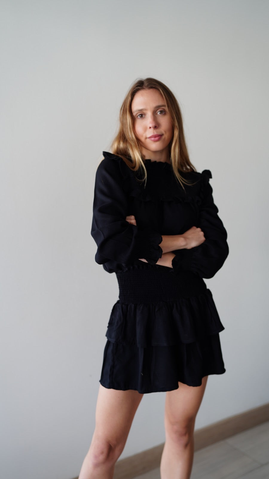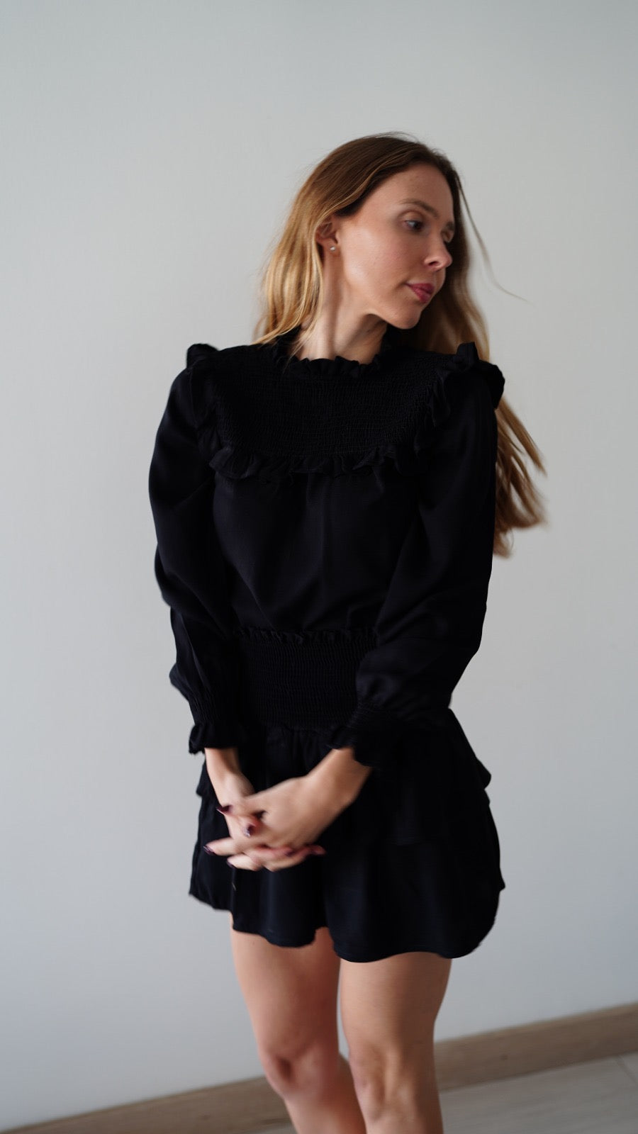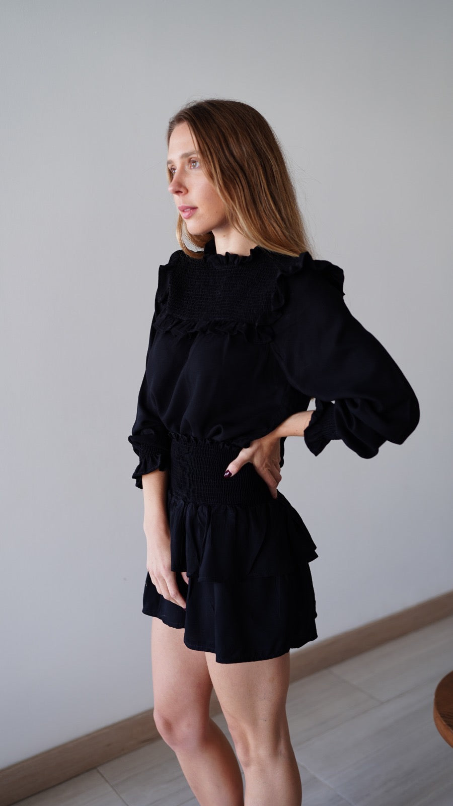Blusa de manga larga confeccionada en viscosa color Negra, un tejido suave y fluido que aporta comodidad y estilo. Sus mangas abullonadas ofrecen un toque romántico y elegante, mientras que el panal de abeja en el pecho resalta la prenda con un detalle texturizado y favorecedor. Ideal para ocasiones especiales o looks sofisticados, esta blusa combina un diseño moderno con un aire femenino y delicado
