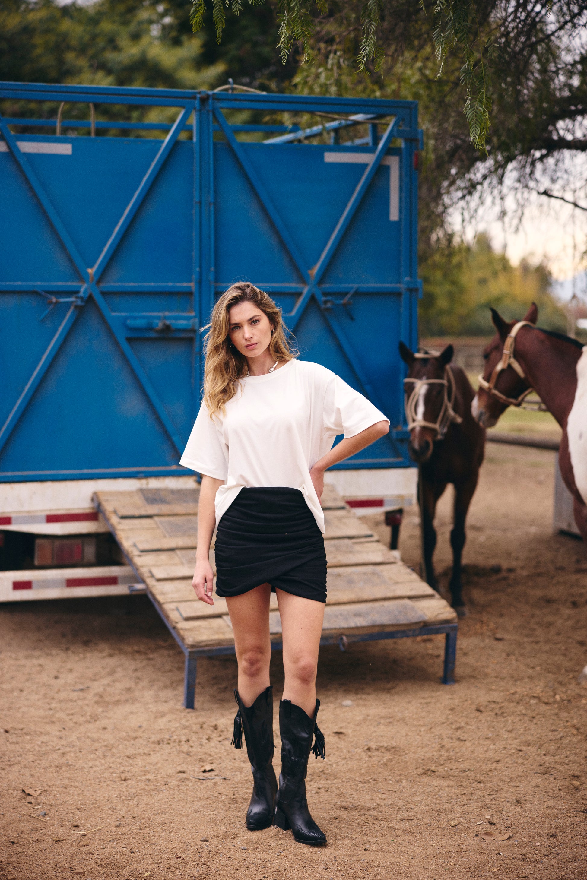 Falda corta con un diseño drapeado que aporta textura y movimiento, creando un efecto elegante y favorecedor. Su silueta ajustada resalta la figura, mientras que el drapeado añade un toque sofisticado y moderno. Versátil y femenina, es ideal para combinar con distintos estilos y lucir en cualquier ocasión