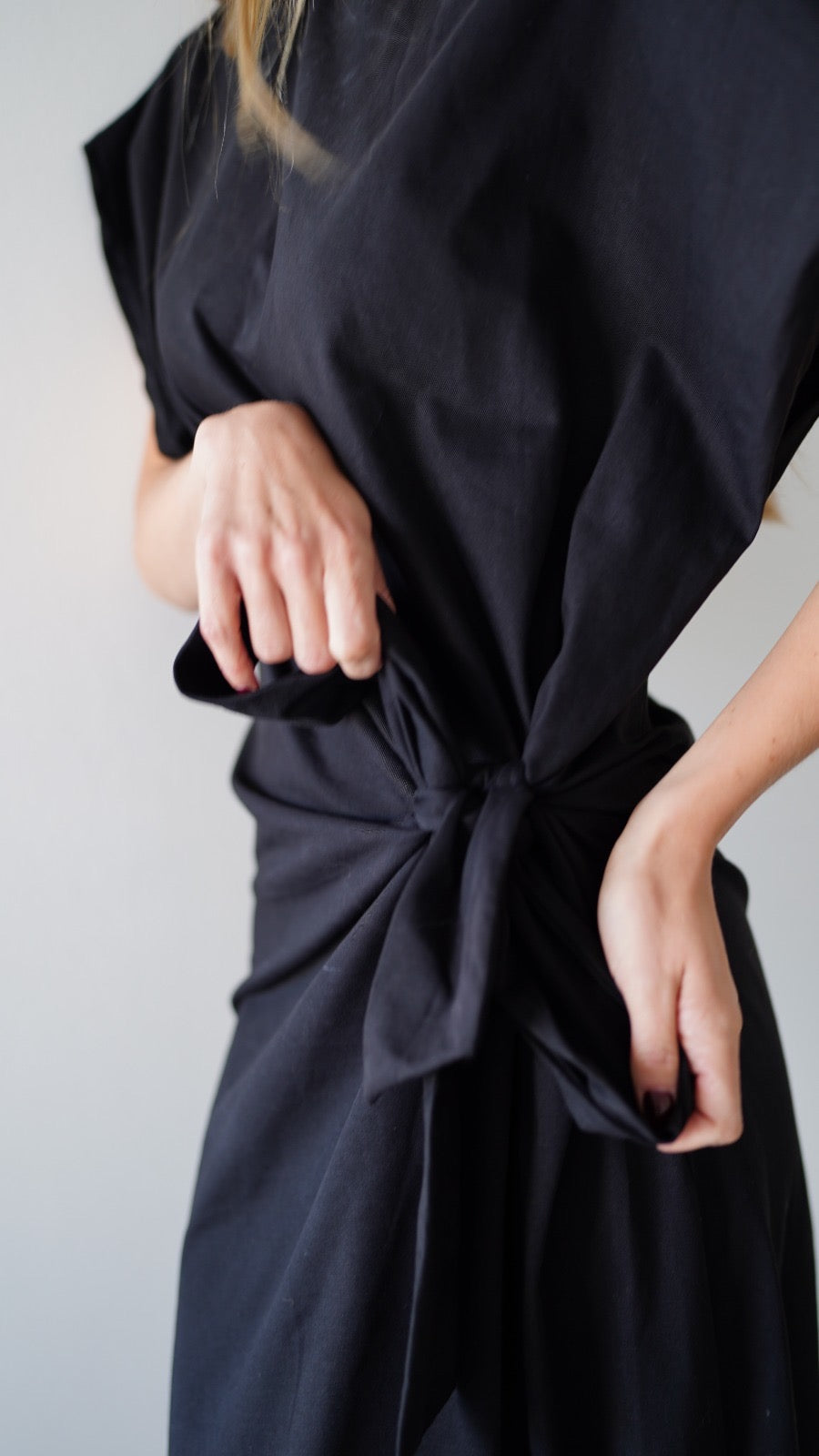 Vestido largo color negro, confeccionado en 100% algodón pima, reconocido por su suavidad y transpirabilidad. Su diseño incluye delicadas mangas románticas que aportan un toque femenino y elegante, mientras que el nudo ajustable en la cintura permite realzar la figura con un ajuste personalizado. Atemporal y versátil, es perfecto para cualquier ocasión, ofreciendo estilo y comodidad en cada detalle